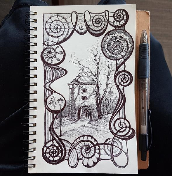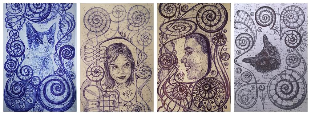 “Prije dvije godine sam na Fejsbuku vidjela reklamu za kurs crtanja i impulsivno kupila taj kurs za 10 dolara. Radi se o kursu na sajtu udemy.com i to je kurs crtanja za početnike. Mislim da normalnim tempom može da se završi za sedmicu dana, uključuje lekcije u obliku video snimaka i trebalo bi da crtate zajedno sa predavačem, a nakon toga vježbate samostalno, a onda predavač komentariše i ocjenjuje vaše radove na dijelu sajta koji se odnosi na pitanja i odgovore. Uz to dobijete pristup na zatvorenu Fejsbuk grupu za crtače početnike. Meni je, standardno prokrastinatorski, trebalo punih šest mjeseci da završim taj kurs. Odradila bih jednu lekciju i onda pauzirala po mjesec-dva. Međutim, kada sam konačno došla do dijela koji se odnosi na potrete, prepoznala sam da je to ono što se savršeno uklapalo u moj tadašnji „stil“ – apstraktne spiralne forme nacrtane na bilješkama, koje su izgledale kao okviri. Portreti su savršeno sjeli u te okvire. Tako je došlo do mog prvog članka na Bored Panda sajtu – Pretvaram prevodilačke bilješke u crteže mačaka.